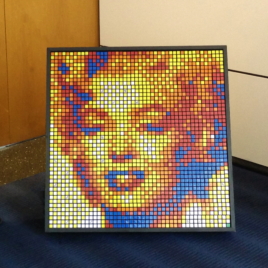 Pete decided to pay homage to Andy Warhol as his works are a staple at the MoMA. His prints of Marilyn Monroe are iconic and portraits of her have been done by other Rubikc's Cube mosaic artists. He thought this would be a good opportunity to throw his hat in the ring.