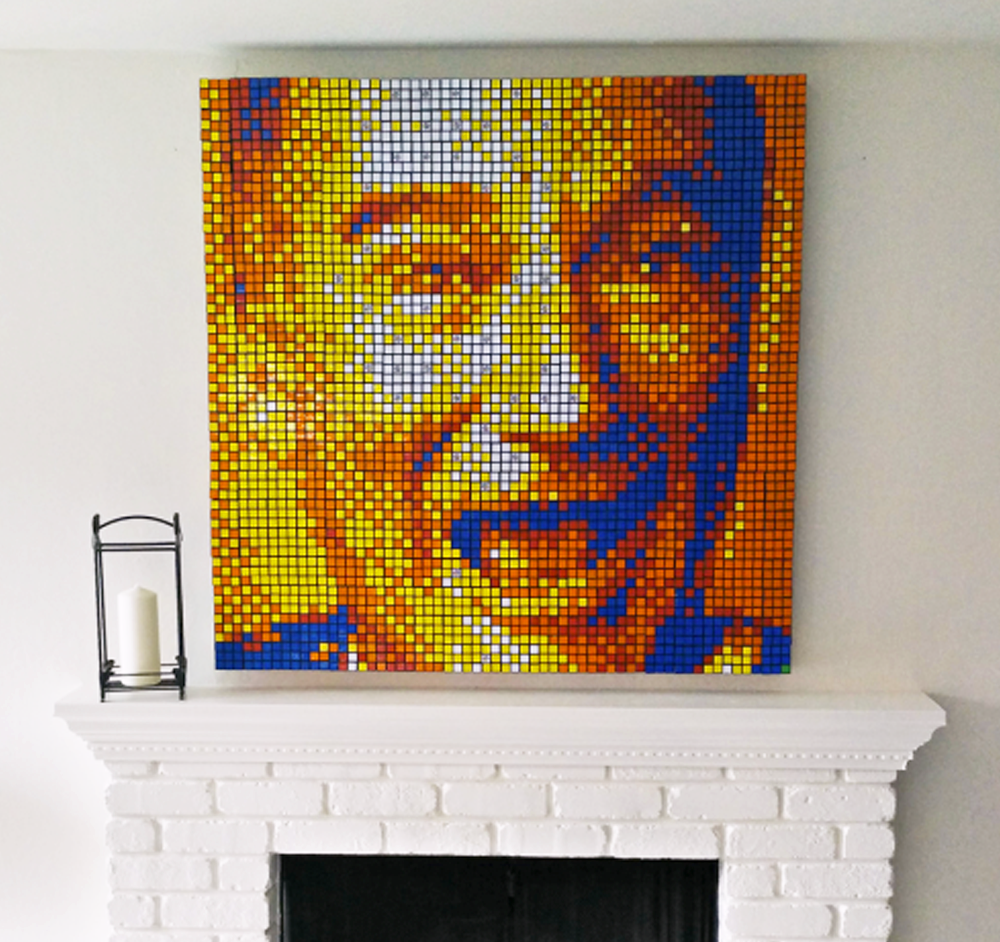 Robin Williams passed away on August 11th, 2014 and on that same day someone contacted Pete about donating a large amount of used Rubik's Cubes. He grew up watching Williams' films and had the idea to build a mosaic to auction off for charity.