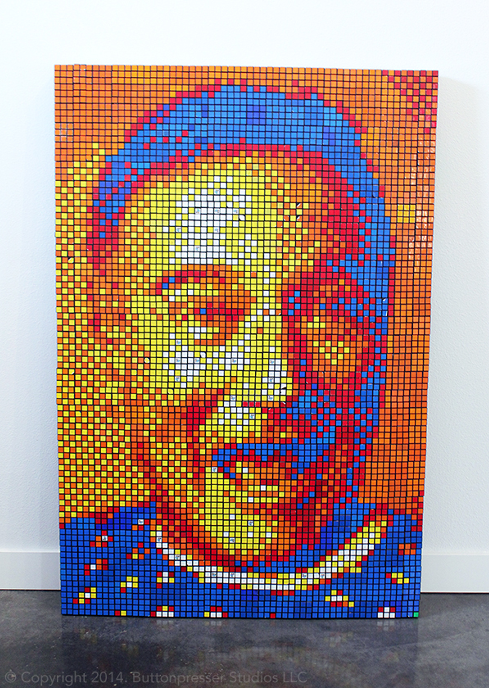 This 600 cube portrait called 'Goofball' was created from start to finish in over 4 hours. Dan worked from one end and Pete worked from the other. A number of San Francisco area news organisations carried a story about the project. Pete put the mosaic on Ebay and auctioned it off for $4300, $4100 of which was split between donations to the American Foundation for Suicide Prevention and St. Jude's Children's Research Hospital.